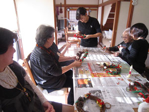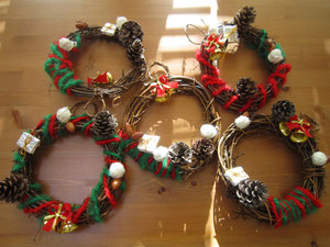 取りに行った松ぼっくり達も加え、リースを皆様思い思いに飾っていただきました。